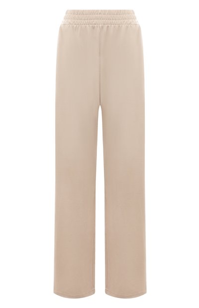 Для пошива бежевых брюк использовали шелковистый эластичный трикотаж, позволивший создать максимально свободный и мягкий силуэт. Благодаря широкому эластичному поясу модель с двумя боковыми карманами обходится без застежки. Наши стилисты считают, что лучшей парой для изделия станет укороченный топ в тон.