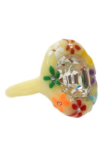 Желтое кольцо с красочным цветочным орнаментом изготовлено дизайнером марки вручную из гипоаллергенной полимерной глины. Повторить форму изделия не получится даже при желании, поэтому каждое украшение по-своему уникально. Аксессуар инкрустирован крупным и миниатюрными сверкающими кристаллами Swarovski.