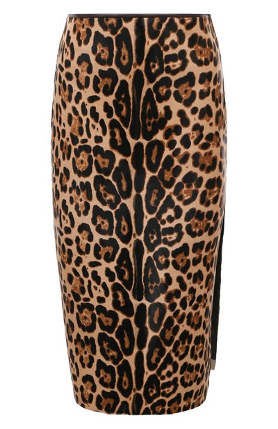 Юбку-карандаш сшили из меха пони с реалистичным леопардовым мотивом. Шелковистый материал с коротким ворсом отливает атласным блеском, оживляя анималистический узор. Верх изделия отделали узкой полоской гладкой кожи. Высокий разрез слева открывает ногу и обеспечивает свободу движений. Чтобы сделать изделии еще удобнее, его дополнили подкладкой из дышащей вискозы. Модель застегивается потайной молнией сбоку.