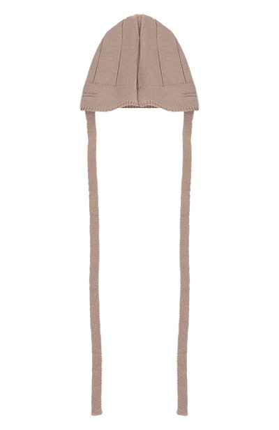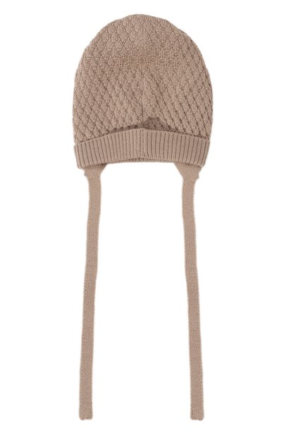 Для изготовления шапки бежевого оттенка использовали нежную хлопковую пряжу. Аксессуар с фактурным геометрическим мотивом станет хорошим решением прохладными днями. Узкие ленты надежно фиксируют модель на голове, обеспечивая ее плотное прилегание для защиты от ветра.
