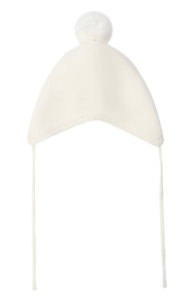 Бежевая облегающая шапка с длинными лентами, завязывающимися под подбородком, связана из тонкой отборной шерсти мериноса. Волокна пряжи не раздражают кожу, а изделия из нее отлично держат тепло. Эластичный аксессуар не электризует волосы и почти не ощущается на голове.