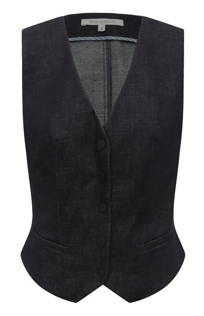 Темно-синий джинсовый жилет с глубоким V-образным вырезом может стать альтернативой топу в повседневном комплекте. Для пошива приталенной модели использовали плотный хлопок, который хорошо держит форму. Переплетение волокон разных оттенков создает деликатный меланжевый эффект.