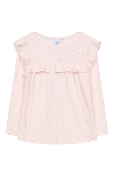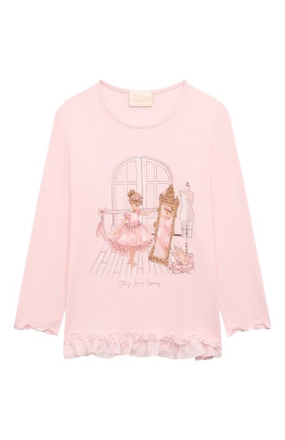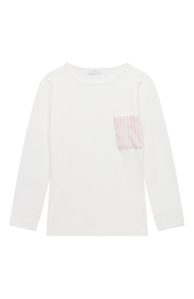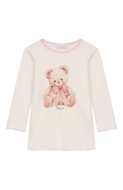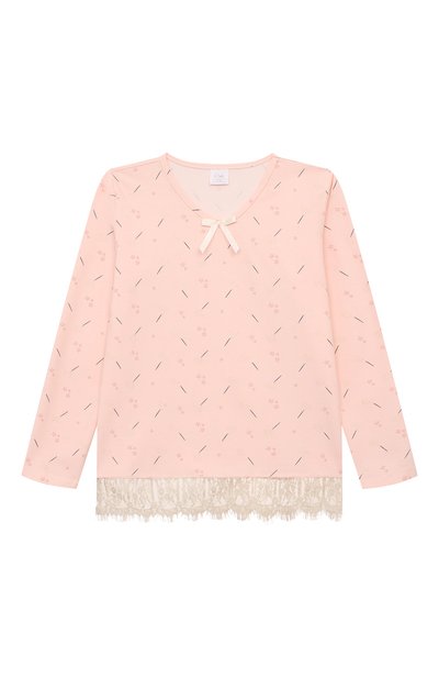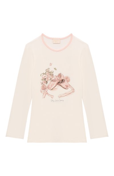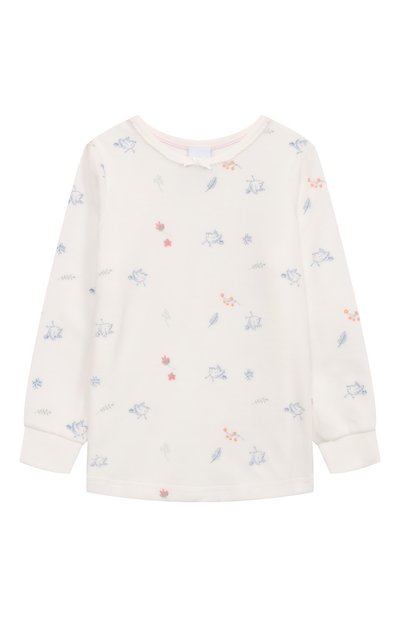 Для изготовления пижамы мастера марки использовали приятный на ощупь трикотаж на основе хлопка и модала. Материал с таким составом получился дышащим и особенно легким, поэтому модель почти не ощущается на теле. Белый лонгслив украсили розовым цветочным принтом.
