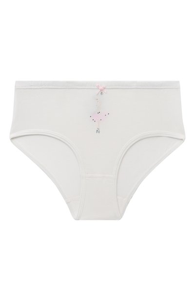 Белые слипы выполнили из мягкого трикотажа, в составе которого поровну соединили хлопок и модал. Они хорошо пропускают воздух, а за удобную посадку отвечает эластан, за счет которого материал тянется. Трусы украсили спереди небольшим пастельным принтом и розовым атласным бантом.
