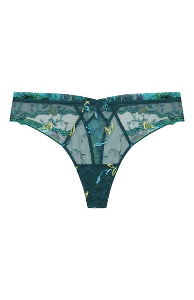 Слипы изумрудного оттенка сшили из полупрозрачного тонкого тюля с ажурной вышивкой с растительным мотивом. Сзади трусы украсили небольшим золотистым кольцом из отполированного до глянцевого блеска металла. Модель с плоскими швами почти не ощущается на теле и не натирает нежную кожу.
