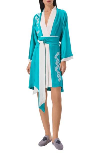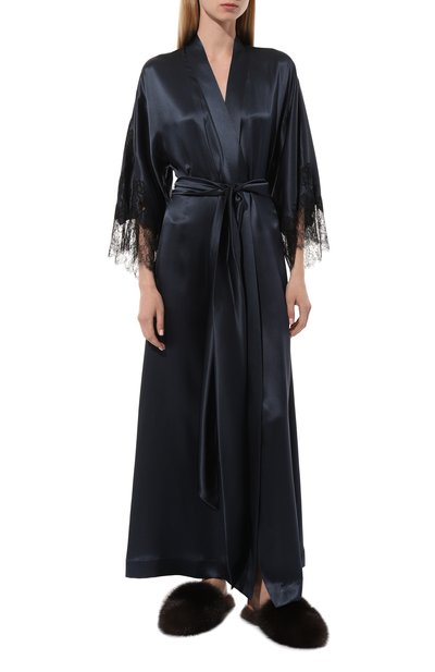 Длинный халат горчичного оттенка нежно скользит по коже и почти не ощущается на теле. Для изготовления модели с широкими рукавами кимоно мастера марки использовали мягкий шелковый атлас. Отделку низа и манжет выполнили из изысканного кружева Leavers с цветочным мотивом и фестончатым краем. В комплекте — пояс-лента, регулирующий глубину запаха.
