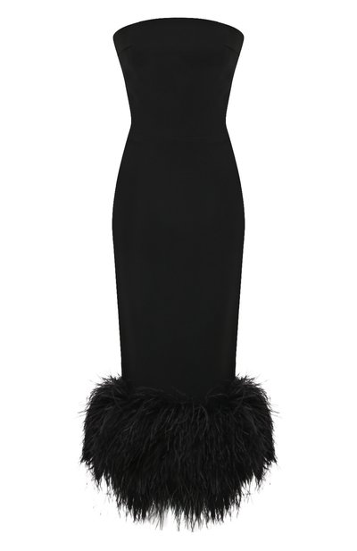 Черное приталенное платье-бюстье – идеальный способ продемонстрировать королевскую осанку. Для пошива облегающего изделия с молнией на спинке использовали мягкий эластичный креп, обеспечивающий комфортную посадку, а чтобы прямой подол не сковывал шаг, сзади предусмотрели длинную шлицу. Особенно эффектной модель делает объемная бахрома из тонких легких перьев.