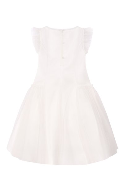 Черное прямое платье с короткими рукавами выглядит нарядным: асимметричный подол украсили объемной многослойной оборкой из белоснежного тюля. Для пошива модели с длинной молнией сзади использовали мягкий смесовый твид с мерцающим клетчатым узором. Плечо декорировали фирменными золотистыми пуговицами с рельефным геральдическим мотивом.