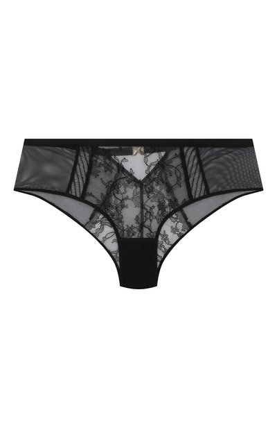 Черные трусы мастера марки выполнили из тонкого полупрозрачного тюля, дополнив вставками из ажурного кружева Leavers. Эластичный пояс модели украсили золотистой деталью в форме литеры Х, изготовленной из тщательно отполированного металла. Изделие с плоскими швами почти не ощущается на коже и комфортно облегает.