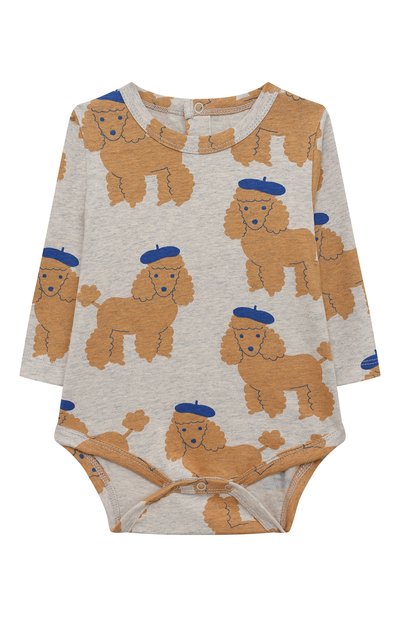 Для пошива серого боди с разноцветным паттерном в виде пуделей использовали тщательно очищенный органический хлопок, выращенный с заботой о природе. Материал с добавлением эластичных волокон приятно ощущается на коже, не вызывая раздражения, и хорошо пропускает воздух. Легкую модель с кнопками на шаговом шве удобно надевать и снимать.
