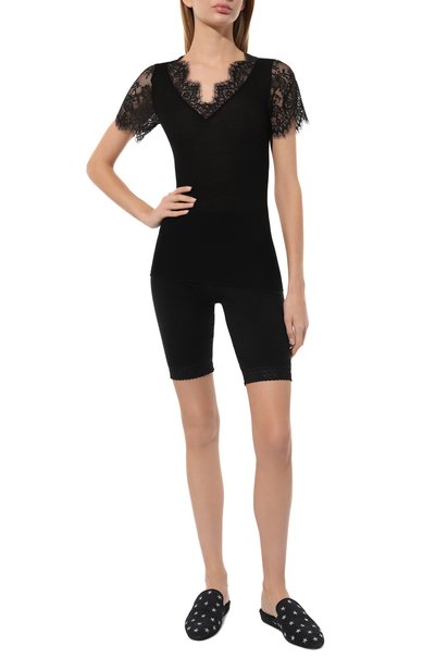 Сдержанный черный цвет и кружевной кант, обрамляющий V-образный вырез, делают облегающий лонгслив универсальным: он будет уместным как дома, так и на городских прогулках. Для изготовления модели использовали тонкий шерстяной трикотаж, усиленный волокнами гладкого шелка.