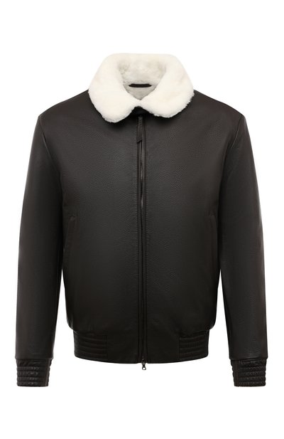 Для пошива бомбера с эластичными поясом и манжетами использовали мягкую кожу ручной выделки. Чтобы подчеркнуть зерненую фактуру материала, его отполировали до глянцевого блеска. Игру на контрасте создали белоснежным мехом нутрии, из которого выполнили внутреннюю отделк у и отложной воротник, трансформирующийся в стойку с помощью короткого ремешка.
