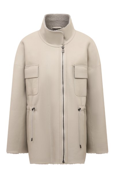 Свободную дубленку спокойного серого цвета выполнили из мягкой легкой овчины бережной ручной выделки. Чтобы подчеркнуть природную фактуру материала, модель с четырьмя накладными карманами и регулируемой кулиской на талии отшлифовали до деликатного блеска. Плотный мех внутри хорошо удерживает тепло, сохраняя чувство комфорта в морозную погоду. Изделие застегивается молнией.