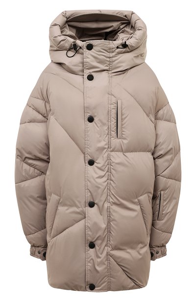 Для пошива свободного стеганого пуховика оттенка капучино использовали прочный матовый полиэстер, защищающий от влаги и ветра. Модель с глубоким регулируемым капюшоном, на котором предусмотрели гибкий козырек, утеплили легким пухом, поэтому в ней будет комфортно в морозную погоду. Куртку с эластичными манжетами дополнили на левом рукаве карманом для ski-pass.