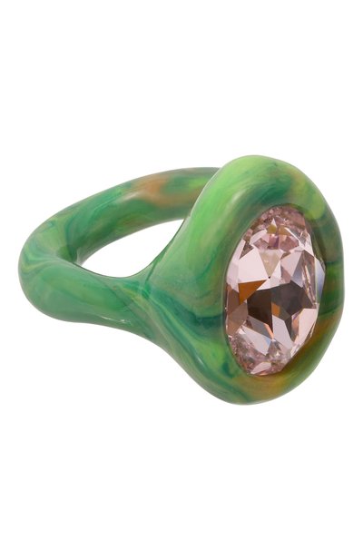 Зеленое кольцо выглядит так, словно его выполнили из малахита. На самом деле для его изготовления использовали легкую полимерную глину, которой придали уникальную неровную форму, запекли при высокой температуре и покрыли тонким слоем глянцевого лака. В центр украшения поместили розовый крупный кристалл Swarovski, мерцающий в лучах света отточенными гранями.