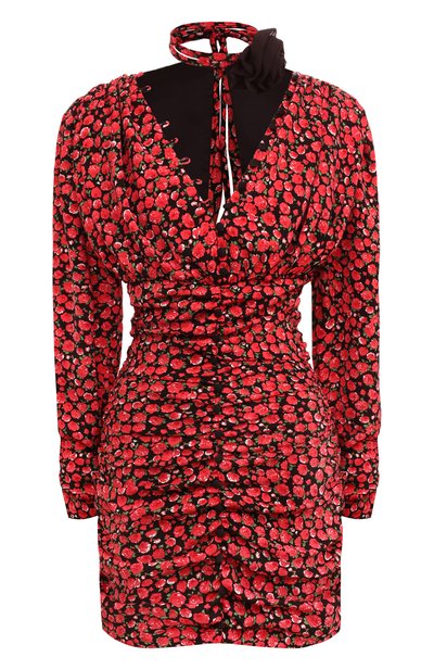 Красное платье с ярким цветочным мотивом наши стилисты предлагают сочетать с обувью и аксессуарами нейтральных тонов. Модель с мягкой драпировкой выполнили из тонкого шелковистого материала на основе вискозы. Из этого же текстиля изготовили деталь, напоминающую чокер с крупным бутоном. Вдоль V-образного декольте разместили пуговицы.