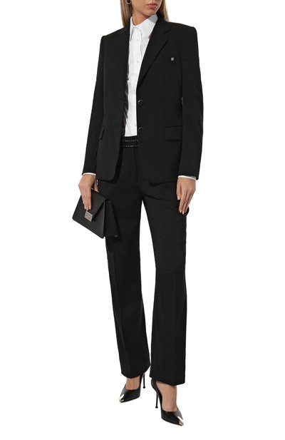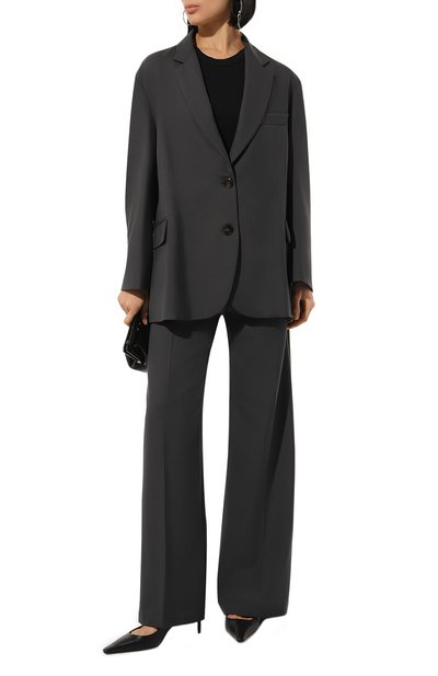 При конструировании жакета глубокого зеленого оттенка Александр Терехов соединил минимализм и безупречность кроя, обеспечивающего комфортную посадку по фигуре и свободу движения. Модель с прямоугольными лацканами выполнили из мягкой ткани с деликатным блеском, сотканной из тщательно очищенной шелковистой шерсти. Наши стилисты предлагают создать образ с парными брюками, топом и балетками.