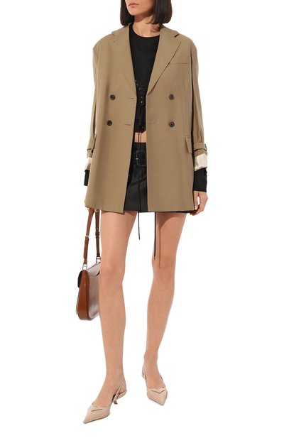 Бежевое свободное пальто с прямоугольными лацканами Миучча Прада сделала романтичнее с помощью объемных рукавов с широкими манжетами. Для пошива модели с двумя боковыми карманами и высокой шлицей сзади использовали мягкий нежный кашемир. Обработка придала легкому, хорошо сохраняющему тепло материалу фактуру, как у стриженого меха.