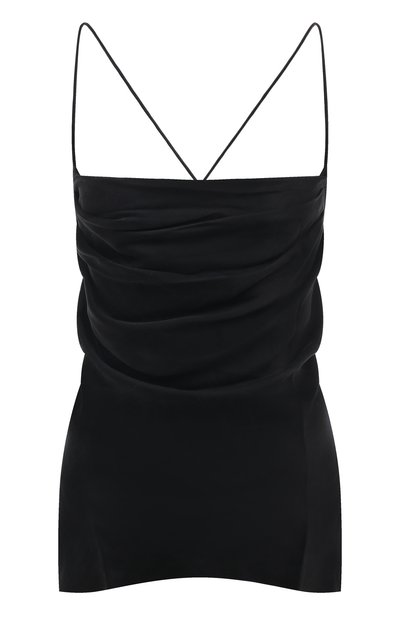 Черный т оп с мягкой естественной драпировкой спереди дополнили узкими бретелями, переходящими в корсетную шнуровку на открытой спине. Для изготовления почти невесомой модели использовали струящийся шелковистый атлас с характерным блеском. Наши стилисты предлагают создать образ total black с брюками и ботильонами.