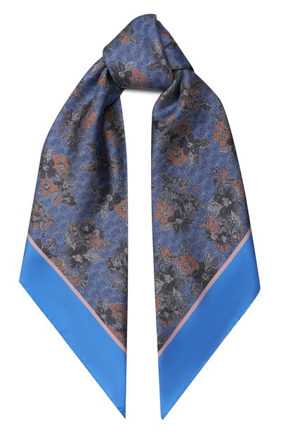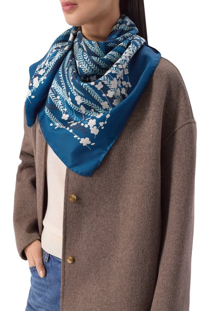 Квадратный платок с широким ярко-синим кантом декорировали принтом Teatro, вдохновленным итальянскими фресками эпохи Ренессанса. Для изготовления модели использовали тонкий шелковый твил с деликатным блеском. Материал с плотным переплетением нитей почти не мнется и хорошо драпируется, поэтому изделие легко стилизовать разными сп особами.