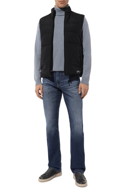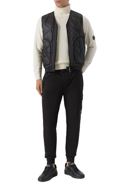 Зеленый жилет сшили из плотного фактурного канваса, который неравномерно окрасили так, что он выглядит слегка выгоревшим на солнце. Спереди разместили врезной и крупные накладные карманы, дополнив один из них нашивкой с культовой эмблемой. Сзади изделие украсили графичным логотипом бренда.