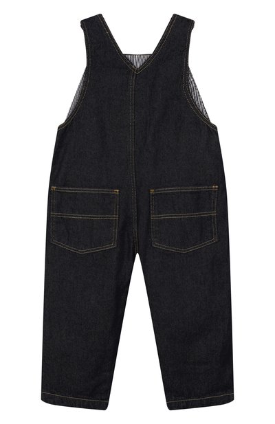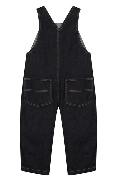 Для пошива голубого комбинезона выбрали мягкую ткань из органического хлопка, не вызывающую аллергию и раздражения даже на самой нежной коже ребенка. Верх модели с накладным карманом и бретелями, перекрещивающимися сзади, украсили широкими оборками. Декор завершили миниатюрными разноцветными вышивками в виде разнообразных фруктов.