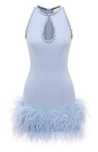 Голубое приталенное мини-платье сшито из дышащего трикотажа с гладкой шелковистой поверхностью. Облегающий лиф с каплевидным вырезом на груди украшен прозрачными гранеными кристаллами. Модель, которую Яна Расковалова отделала стилизованным боа из тонких воздушных перьев, застегивается сзади потайной молнией.