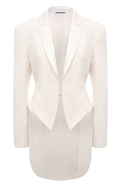Крой жакета молочного оттенка позаимствовали у фрака. Для пошива приталенной модели с акцентированной линией плеч использовали легкую матовую шерсть. Этому материалу противопоставили гладкий атлас с характерным блеском, которым подчеркнули лацканы. Предлагаем сочетать такое изделие с парными брюками и светло-бежевым топом.