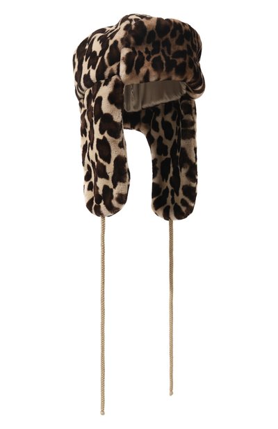 Шапку-ушанку leo с широким козырьком выполнили из напоминающего норку материала с леопардовым принтом. Аксессуар завязывается длинными шнурками на наушниках.