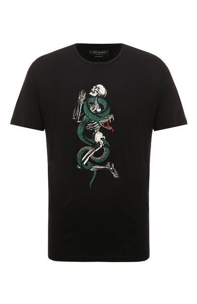 Центральным элементом декора футболки из мягкого хлопка стал фирменный силуэт скелета в молитвенной позе. Знаковый принт дополнили извивающейся змеей, вышитой зелеными и красными нитями. Модель станет главной в образе, если надеть ее с лаконичными брюками, курткой и кроссовками.