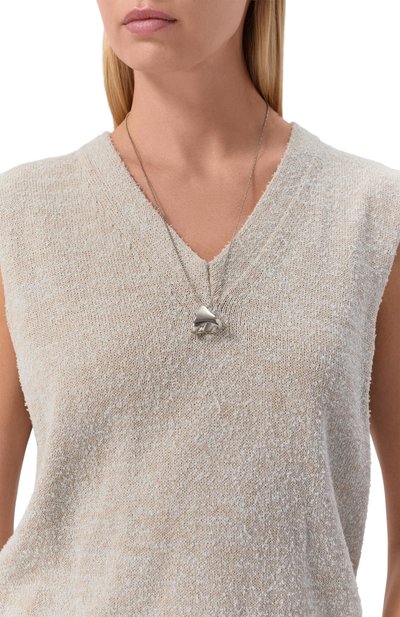 Подвеску в виде лупы с линзой из горного хрусталя в огранке «калейдоскоп» с одной стороны выполнили из серебра 925-й пробы с родиевым покрытием. Из такого же материала изготовили тонкую цепочку с застежкой-карабином.