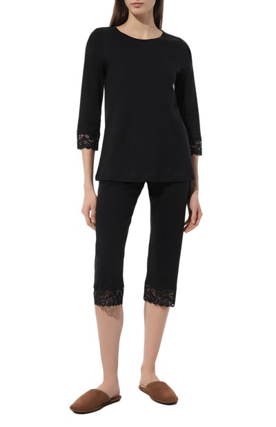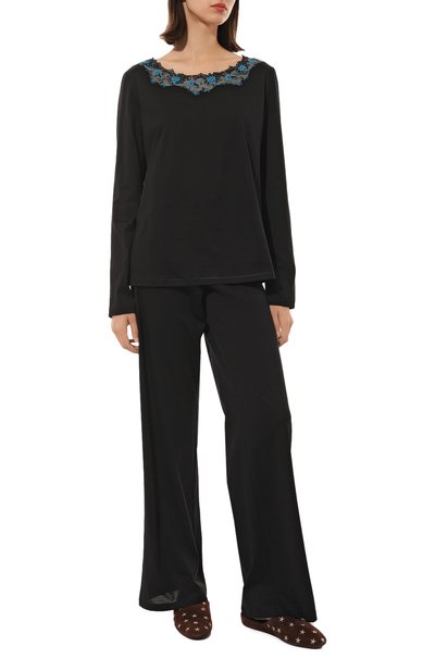 Пижаму из линии Moments Nw выполнили из хлопкового интерлока. V-образный вырез и манжеты лонгслива отделали кружевом с фестончатыми краями. У брюк прямого кроя предусмотрели эластичный пояс.