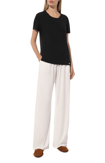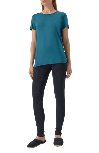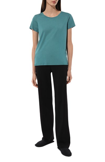 В бирюзовой футболке из линии Sleep & Lounge будет комфортно во время сна и отдыха. Для изготовления модели с глубоким V-образным вырезом использовали нежное на ощупь джерси, которое связали из тонкой пряжи на основе шелковистого модала и длинноволокнистого хлопка. Такой материал отлично пропускает воздух, поэтому в изделии не будет жарко.