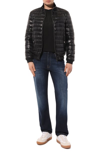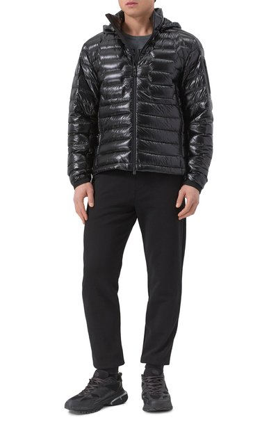 Стеганую куртку с воротником-стойкой сшили из водоотталкивающего непродуваемого нейлона и утеплили тонким слоем утиного пуха с добавлением вторичного полиэстера. Модель дополнили двумя боковыми прорезными карманами на молнии и двумя внутренними. На левый рукав поместили прорезиненный патч.