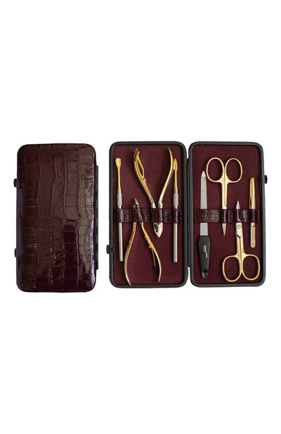 В чехле из натуральной кожи с металлическим каркасом и замком-защелкой — десять предметов, необходимых для ухода за руками и бородой. Это пинцет, пилка, двусторонний пушер-клиннер, трое щипцов (для ногтей и для заусенцев) и четыре пары ножниц (парикмахерские, для ногтей, заусенцев, усов, носа и бороды). Все инструменты выполнены из закаленной высокоуглеродистой стали, которая долго сохраняет остроту режущих кромок. Во избежание окисления металла инструменты после каждого использования нужно тщательно вытереть и хранить в чистоте и сухости.