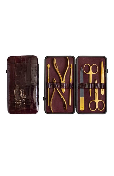 В чехле из натуральной кожи с металлическим каркасом и замком-защелкой — десять предметов, необходимых для ухода за руками и бородой. Это пинцет, пилка, двусторонний пушер-клиннер, трое щипцов (для ногтей и для заусенцев) и четыре пары ножниц (парикмахерские, для ногтей, заусенцев, усов, носа и бороды). Все инструменты выполнены из закаленной высокоуглеродистой стали, которая долго сохраняет остроту режущих кромок. Во избежание окисления металла инструменты после каждого использования нужно тщатель но вытереть и хранить в чистоте и сухости.