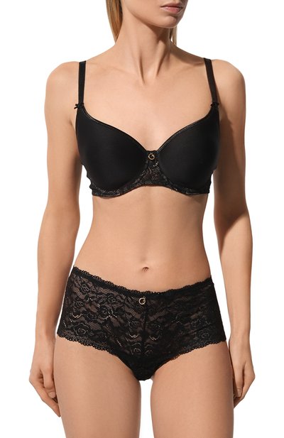 Черные трусы-шорты сшили из легкого эластичного кружева с цветочным мотивом, поэтому они плотно облегают фигуру, оставаясь незаметными под тонкой одеждой. Изысканность модели из коллекции Gold Pleasure добавляет съемная тонкая цепочка с миниатюрными кристальными подвесками, продетая через кольцо на треугольном вырезе сзади.