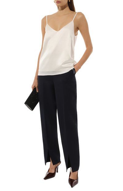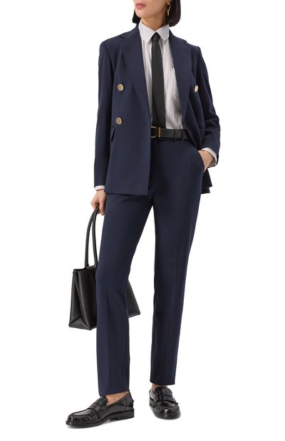 Зауженные брюки темно-синего оттенка выполнены из тонкой костюмной ткани: сочетание шерсти и вискозы делает материал прочным и приятным к телу, а благодаря эластану в составе изделие слегка тя нется, обеспечивая комфортную посадку. Наши стилисты предлагают сочетать модель с жилетом и классическим пальто в строгом образе.