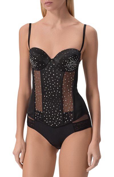 В коллекцию Tattoo, вдохновленную татуировками, вошло бюстье с цветочным мотивом. Его вышили по полупрозрачному нежному тюлю телесного оттенка, поэтому декор выглядит на коже как тату. Заднюю часть модели с мягкими чашечками на косточках и съемными регулируемыми бретелями выполнили из шелкового эластичного атласа.