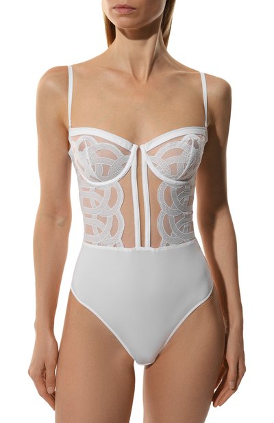 Для изготовления боди с мягкими треугольными чашечками, подчеркнутыми широкими фестонами, использовали почти невесомый прозрачный тюль. На этом воздушном эластичном материале вышили ажурный мотив нитями насыщенного бордового цвета. Модель с регулируемыми бретелями застегивается короткой молнией сзади.