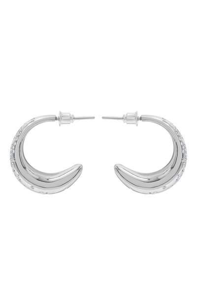 Евгения Левашова-Елагина придала незамкнутым серьгам-кольцам каплевидную форму. Аксессуар изготовили из прочного серебра 925-й пробы. Холодное сияние отполированного до зеркальной гладкости металла усилили ледяным блеском паве из миниатюрных фианитов.