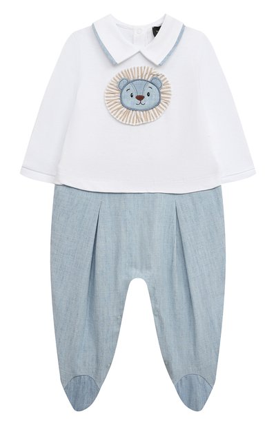 Этот комбинезон стилизовали под комплект из свободной белой блузы и голубых ползунков с закрытыми стопами. Для изготовления модели с длинными рукавами и отложным воротником использовали комбинацию эластичного джерси и тонкой легкой ткани из отборного дышащего хлопка. Изделие с кнопками на спинке декорировали спереди крупной аппликацией.