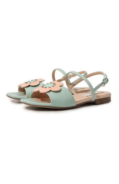 Светло-зеленые сандалии изготовили из прочного материала Alter Mat, напоминающего гладкую матовую кожу. Широкую перемычку украсили крупной аппликацией в виде цветка, середину которого акцентировали разноцветными кристаллами. Гибкая подошва амортизирует, обеспечивая комфорт во время прогулок.