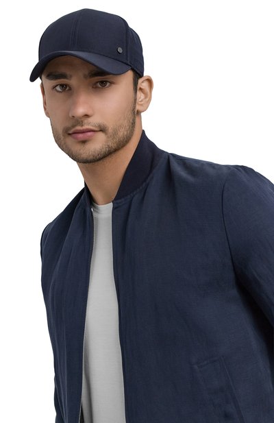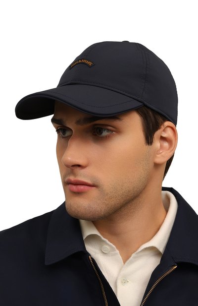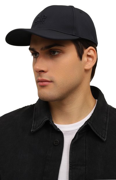 Темно-синяя однотонная бейсболка с широким изогнутым козырьком сшита из прочного рипстопа. Фактурный легкий материал не промокает и не продувается, а изделия из него хорошо держат заданную форму. Аксессуар с металлическими люверсами, пропускающими воздух внутрь, украшен круглой заклепкой с логотипом марки.