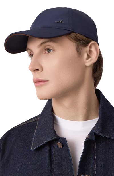Темно-синяя однотонная бейсболка с широким изогнутым козырьком сшита из пр очного рипстопа. Фактурный легкий материал не промокает и не продувается, а изделия из него хорошо держат заданную форму. Аксессуар с металлическими люверсами, пропускающими воздух внутрь, украшен круглой заклепкой с логотипом марки.