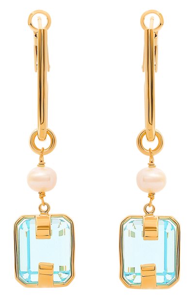 Длинные серьги с покрытием из 24-каратного золота изготовлены вручную из гипоаллергенного ювелирного сплава. Подвижные подвески с перламутровыми культивированными жемчужинами инкрустированы прозрачными голубыми кристаллами искусной огранки, сквозь которые свободно проходят лучи света, создавая игру бликов.