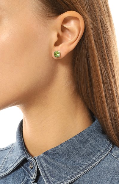 Для изготовления серег с застежками-пусетами использовали ювелирный сплав с защитным родиевым покрытием. Изделие дополнили подвижной прямоугольной подвеской, инкрустированной крупн ым граненым кристаллом оттенка зеленого яблока.