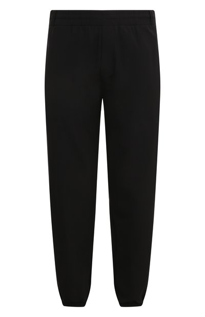 Для пошива свободных темно-синих джоггеров использовали гладкий легкий материал стрейч, который тянется в четырех направлениях. В изделии предусмотрели четыре кармана: два врезных боковых и пару накладных задних. Эластичный пояс дополнили шлевками, поэтому посадку брюк можно регулировать ремнем.
