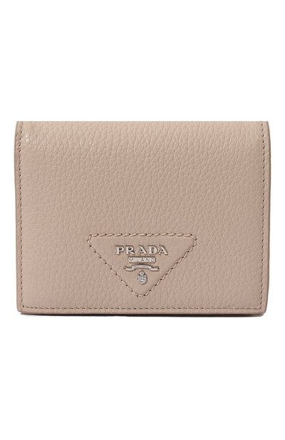 Бежевое портмоне двойного сложения получилось компактным и при этом вместительным. Внутри – отсек для купюр, карман для монет и четыре слота для кредитных карт. Аксессуар из зернистой матовой кожи украсили вышитым фирменным треугольником с металлической символикой марки.