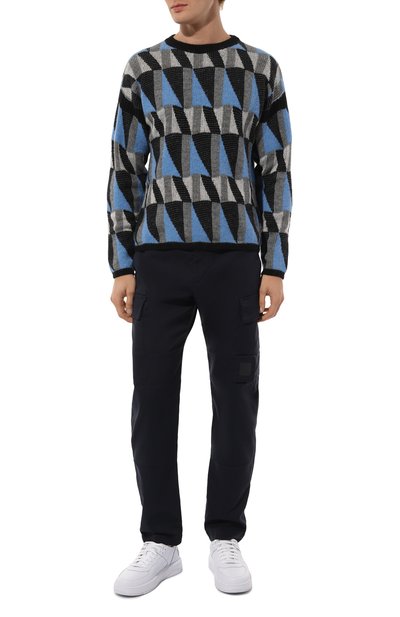 Темно-синие карго сшили из прочного эластичного нейлона, хорошо пропускающего воздух и не требующего особенного ухода. Привычные для такой модели карманы на брючинах сделали менее заметными, а задний дополнили молнией. Оптимальную посадку на талии обеспечивает пояс со шлевками и потайной эластичной вставкой.